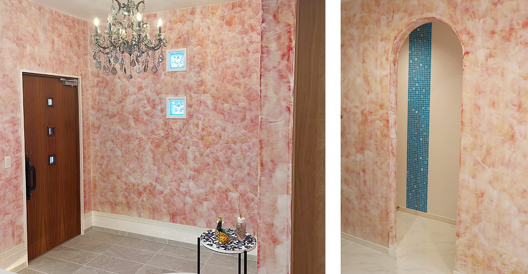 玄関ホールの西洋漆喰の壁は、高い施工技術が必要なために京都から職人さんに来ていただきました。