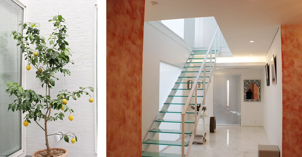 お風呂や洗面台、木製の玄関ドア、玄関ホールから続く吹抜け階段と大空間、そして西洋の石畳の道路をイメージした銀杏貼りタイルの床の中庭とお気に入りポイントもたくさんあります。